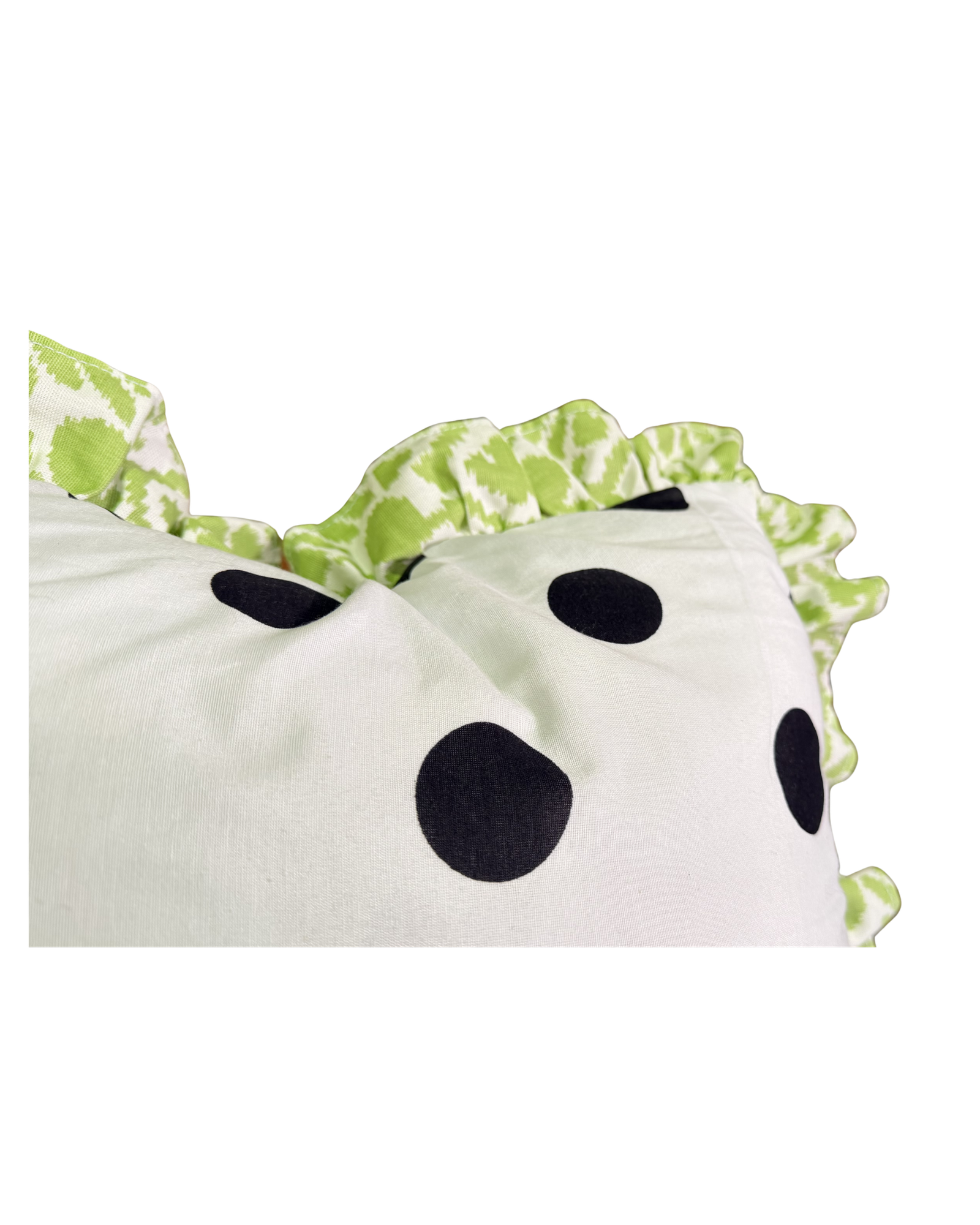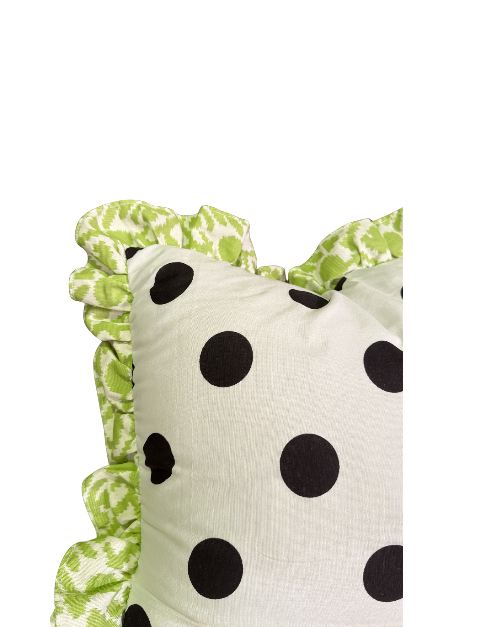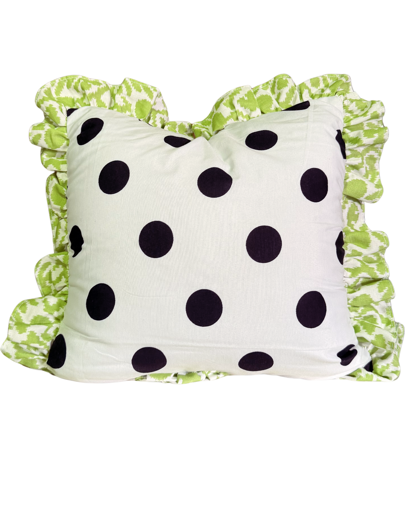 A joyful statement piece, this cushion brings a burst of personality to any space. Bold polka dots meet a lively ruffled trim in fresh, playful patterns- creating a look that’s both whimsical and eye-catching. Soft, full, and irresistibly charming, it’s made to brighten your couch or bed and turn everyday moments into something a little more magical.